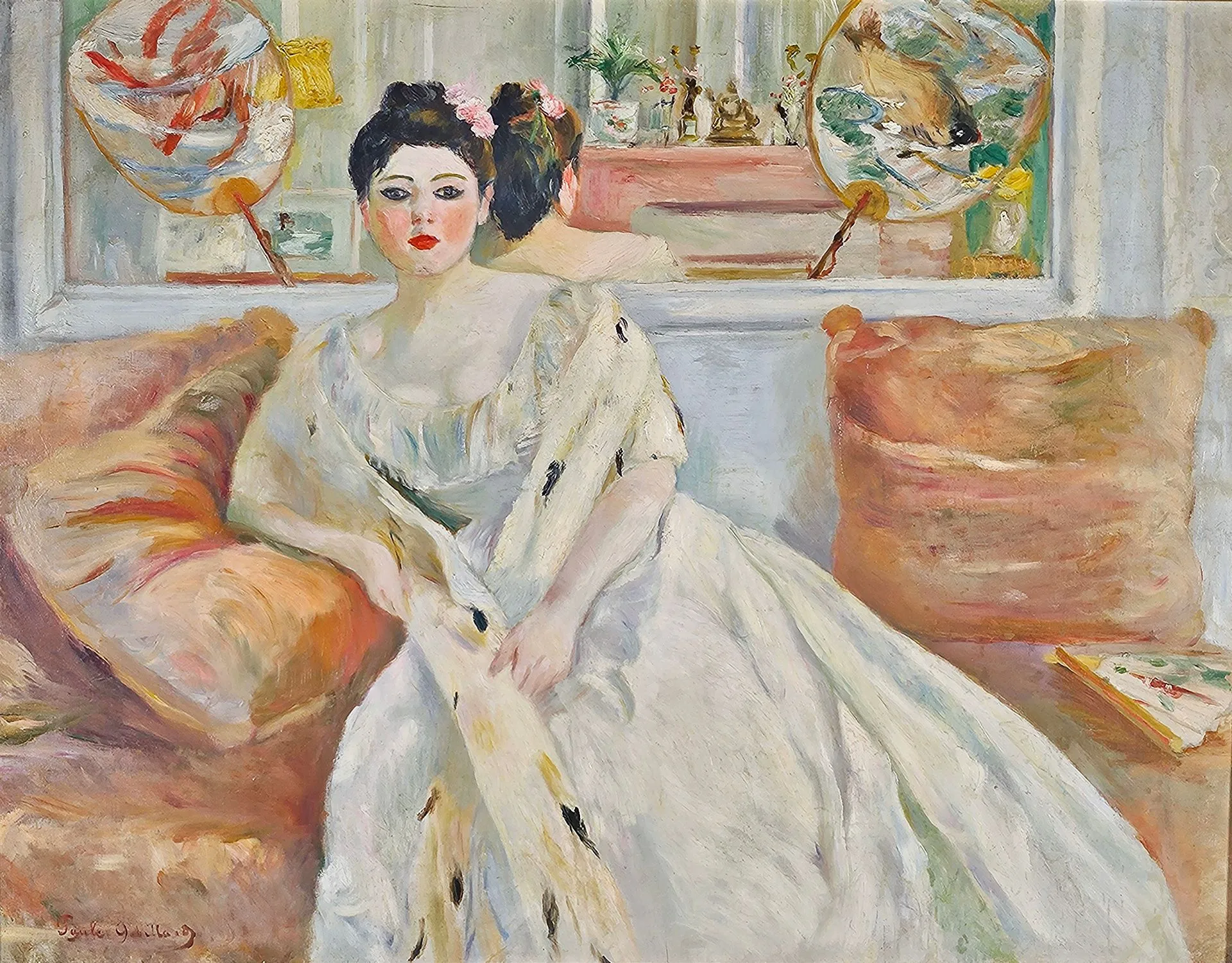 In several paintings, Paule Gobillard also introduces Japoniste elements, echoing the Rouart Manet family’s taste for objects from the Far East. Decorative screens, large blue and white vases, round fans, and small objects placed in front of mirrors structure the space as much as they decorate the drawing room. These motifs, inherited from prints and fin de siècle Japonisme, flatten the background, shift the image’s center of gravity, and place her models in a world that is both domestic and open to Japanese visual culture.